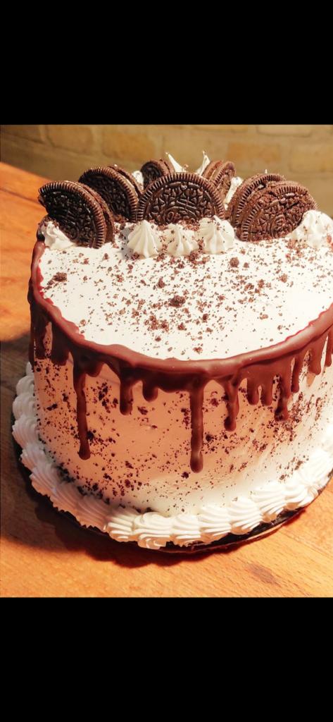 Cake oanetela de chocolate relleno de crema de chocolate y avellana , vestido de merengue con galleticas oreo trituradas y decorados con chocolate y diversas galletas